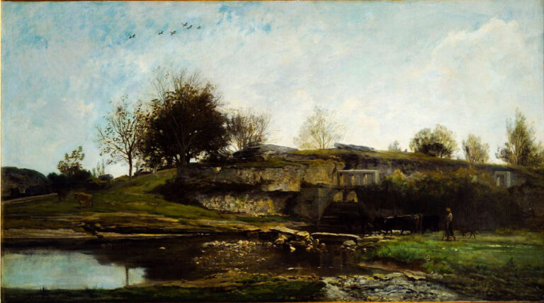 Daubigny, ein bedeutender Vertreter der Schule von Barbizon, verwendete lockere Pinselstriche und eine subtile Farbpalette, um die Lichtverhältnisse und die Atmosphäre der Landschaft realistisch einzufangen. Die Komposition des Gemäldes zeichnet sich durch einen natürlichen Flussverlauf aus, bei dem das Wasser sanft durch die Schleuse strömt. Bäume und Vegetation umrahmen die Szene, während das Himmelsbild in sanften Farbtönen gehalten ist und zur harmonischen Wirkung beiträgt.